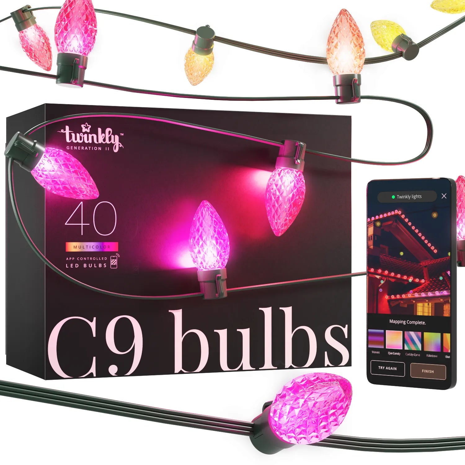 The C9 Bulb string lights, powered by Twinkly's patented smart lighting technology, bring pure magic to the holidays, offering extraordinary brightness and personalized, stunning animations in over 16 million colors. Map your lights using your smartphone camera and app, unlocking endless color gradients, effects, and grouping options to virtually connect thousands of lights into elaborate, synchronized displays. The ultra-durable, weather-resistant design is built to last year after year.