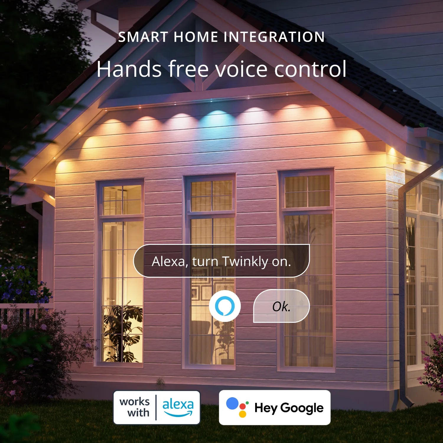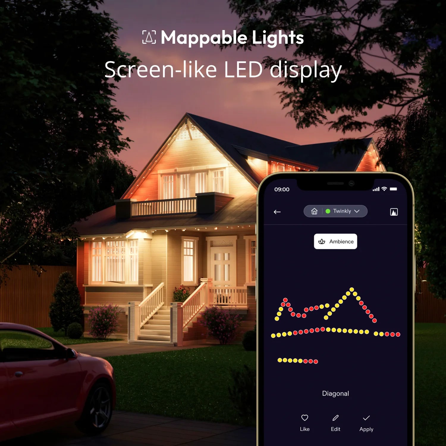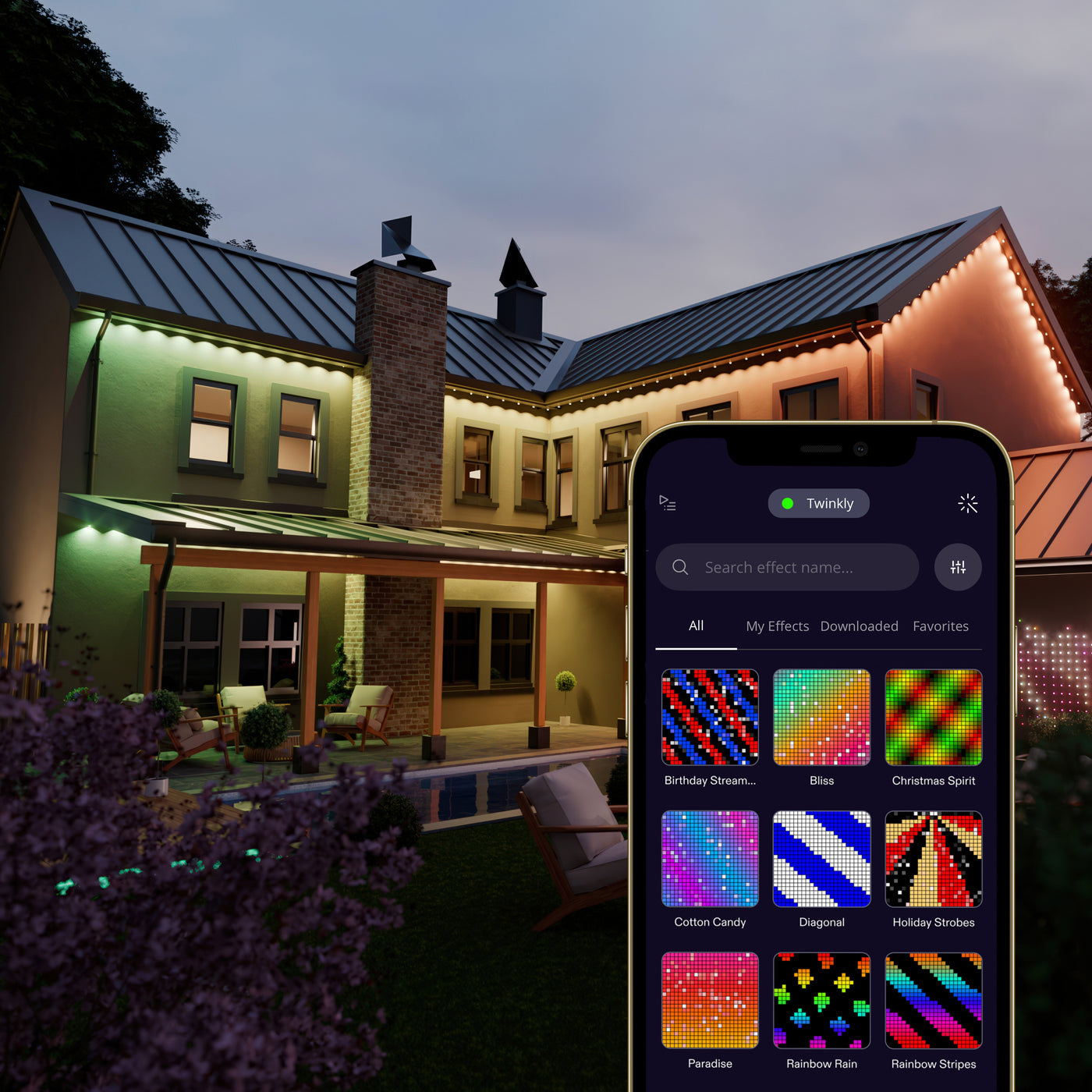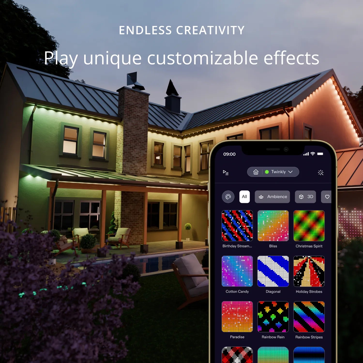 Twinkly's durable, smart outdoor lights shine with extraordinary intensity in over 16 million colors—on roof edges, eaves, fences, and paths—for personalized home decoration year-round. Patented mapping technology and the Twinkly app put you in control of each LED, allowing you to display and personalize endless effects, or even create your own. Map and connect multiple Twinkly devices to create synchronized installations year-round.