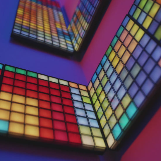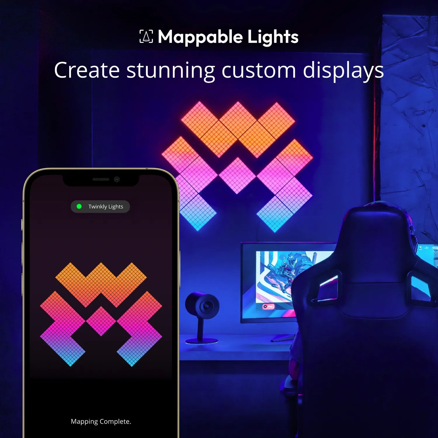 Modular panels play an endless array of app-controlled content—from perfectly rendered animated graphics and GIFs to personalized lighting effects in over 16 million colors. Squares seamlessly integrate with the gaming world and can be virtually connected to other Twinkly lights to create synchronized installations.