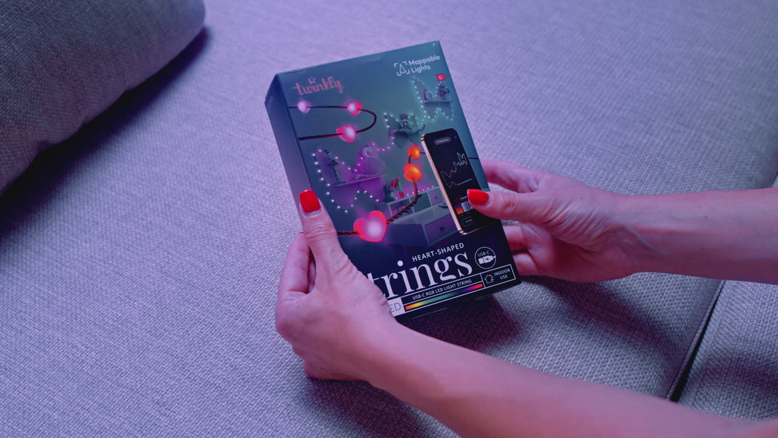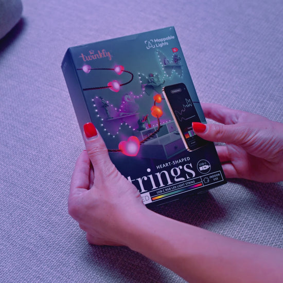 Twinkly Strings USB-C Hearts bring magic to any space – their heart-shaped design, intelligent LEDs, and lightweight, portable design create a warm and atmospheric atmosphere with customizable lighting effects. The Twinkly app transforms them into displays of light, allowing for unlimited personalization and the creation of your own effects in over 16 million vibrant colors.